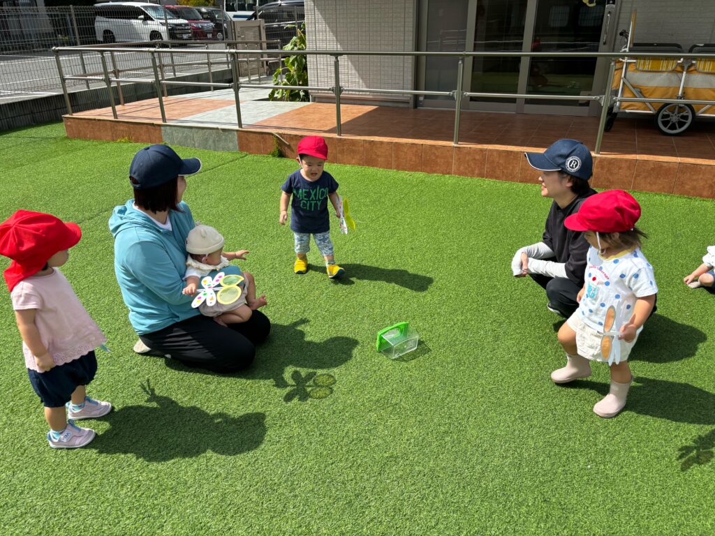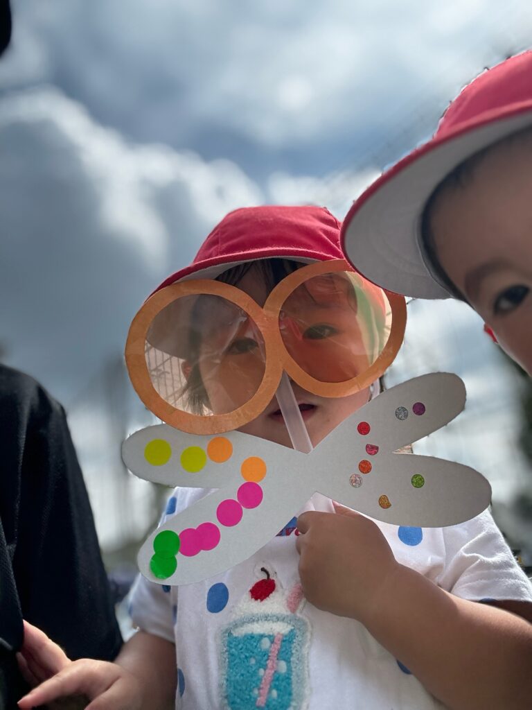 作った後は園庭でいろいろな物を見て遊びました。いつもと違う色に見えて面白いね!